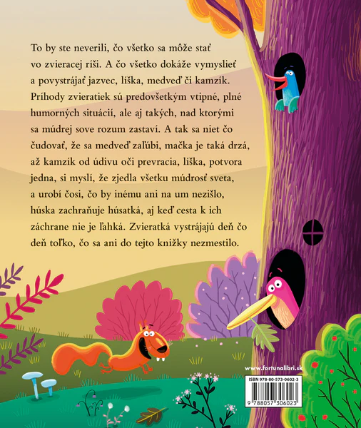 To by ste neverili, čo všetko sa môže stať vo zvieracej ríši. A čo všetko dokáže vymyslieť a povystrájať jazvec, líška, medveď, či kamzík. Príhody zvieratiek sú predovšetkým vtipné, plné humorných situácií, ale aj takých, nad ktorými sa múdrej sove rozum zastaví. A tak sa niet čo čudovať, že sa medveď zaľúbi, mačka je taká drzá, až kamzík od údivu oči prevracia, líška, potvora jedna, si myslí, že zjedla všetku múdrosť sveta, a urobí čosi, čo by inému ani na um nezišlo, húska zachraňuje húsatká, aj keď cesta k ich záchrane nie je ľahká. Zvieratká vystrájajú deň čo deň toľko, čo sa ani do tejto knižky nezmestilo.