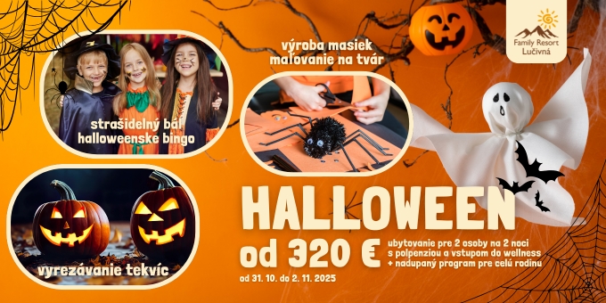 Počas Halloweenskeho víkendu na vás v najväčšom rodinnom rezorte na Slovensku, vo Family Resort Lučivná, čaká bohatý program plný zábavy pre všetky vekové kategórie. Spoločne si vyrobíme strašidelné masky, vyrežeme halloweenske tekvice a vybláznime sa na strašidelnom bále. Všetky malé strašidlá poteší animačný program aj maľovanie na tvár. A každé veľké strašidlo, ktoré príde v maske, dostane welcome drink zdarma. Prekonajte svoj strach a zažite neopakovateľný Halloween v najväčšom rodinnom rezorte v objatí Vysokých Tatier. Pobytový balíček je platný od 31. októbra do 2. novembra 2025.