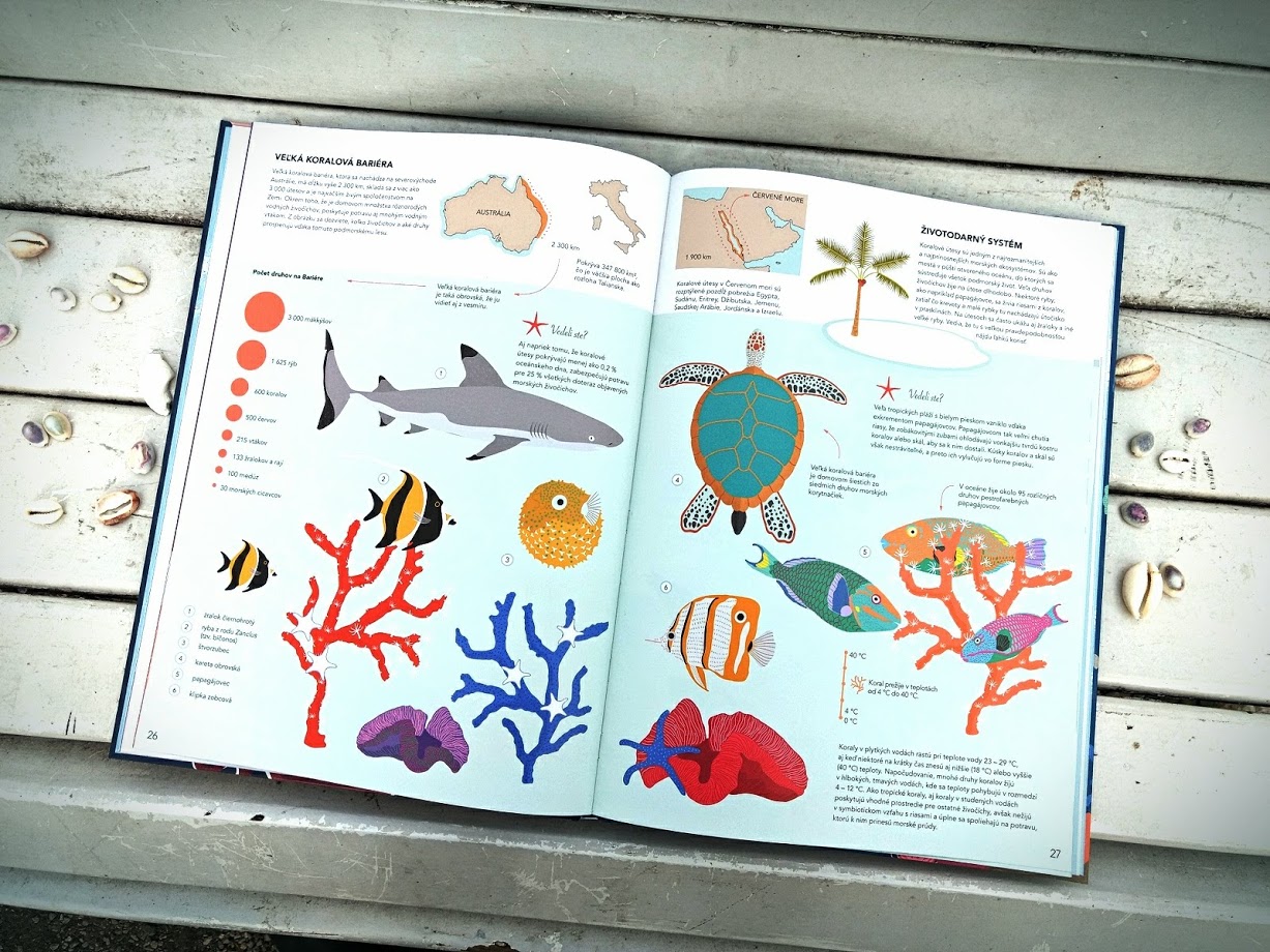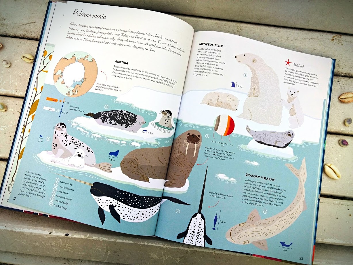 Anotácia zmieňuje, že publikácia je vedená formou infografiky a mne sa tento termín veľmi páči. Obrázky sú v symbióze s textom a vzájomne sa dopĺňajú. Pri zvieratách sú vysvetlivky, o aký druh sa jedná, a vo väčšine prípadov sú obrázky doplnené aj šípkami znázorňujúcimi veľkosť v skutočnosti, pretože knižné pravítko nezodpovedá ich reálnej veľkosti.