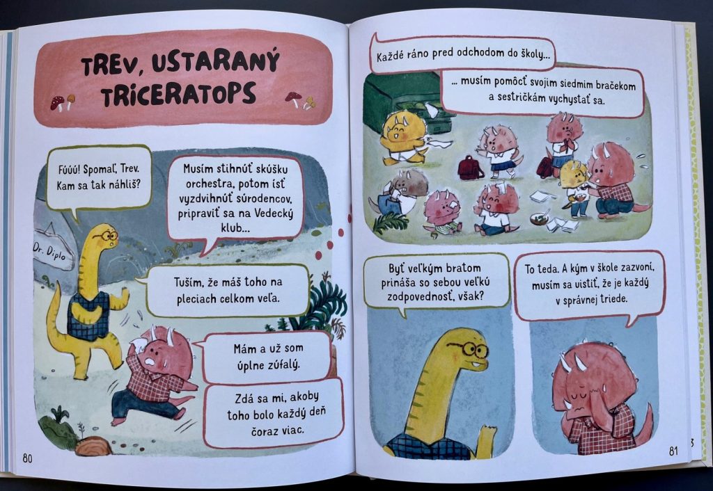 Každý z desiatich dinosaurov stelesňuje inú emóciu – od radosti a zvedavosti až po úzkosť a hnev. Napríklad Triceratops Trev je ustaraný a má toho na pleciach naozaj priveľa. Nino je zasa spokojný spisnosaurus, ktorý je šťastný taký, aký je…a to je vzor aj pre nás.