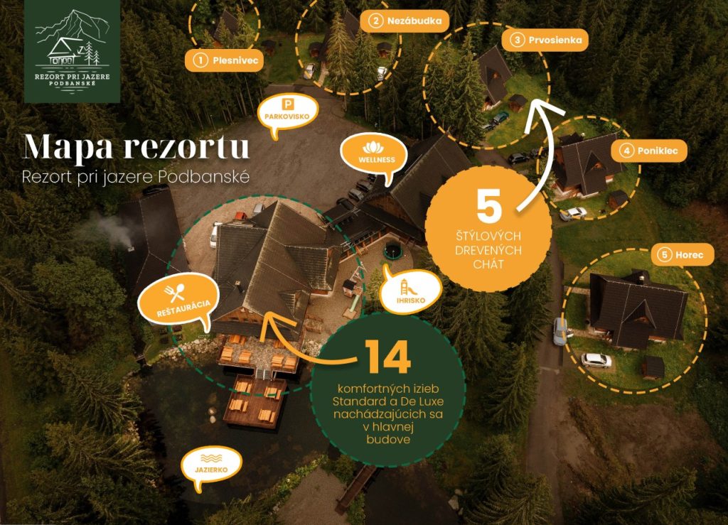 V Rezorte pri jazere Podbanské si môžete vybrať z rôznych druhov ubytovania, podľa toho, ktoré práve vám vyhovuje najviac. Päť štýlových drevených chát, desať komfortných izieb alebo dva apatrmány- všetko v obklopení ticha lesa. Doprajte si jedinečný oddych v lone tatranskej prírody.
