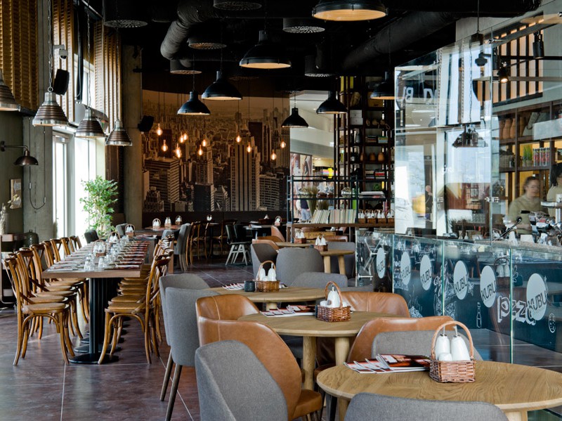 Interiér s jemne priemyselnou atmosférou a otvorenou kuchyňou, kde je hosť súčasťou diania.