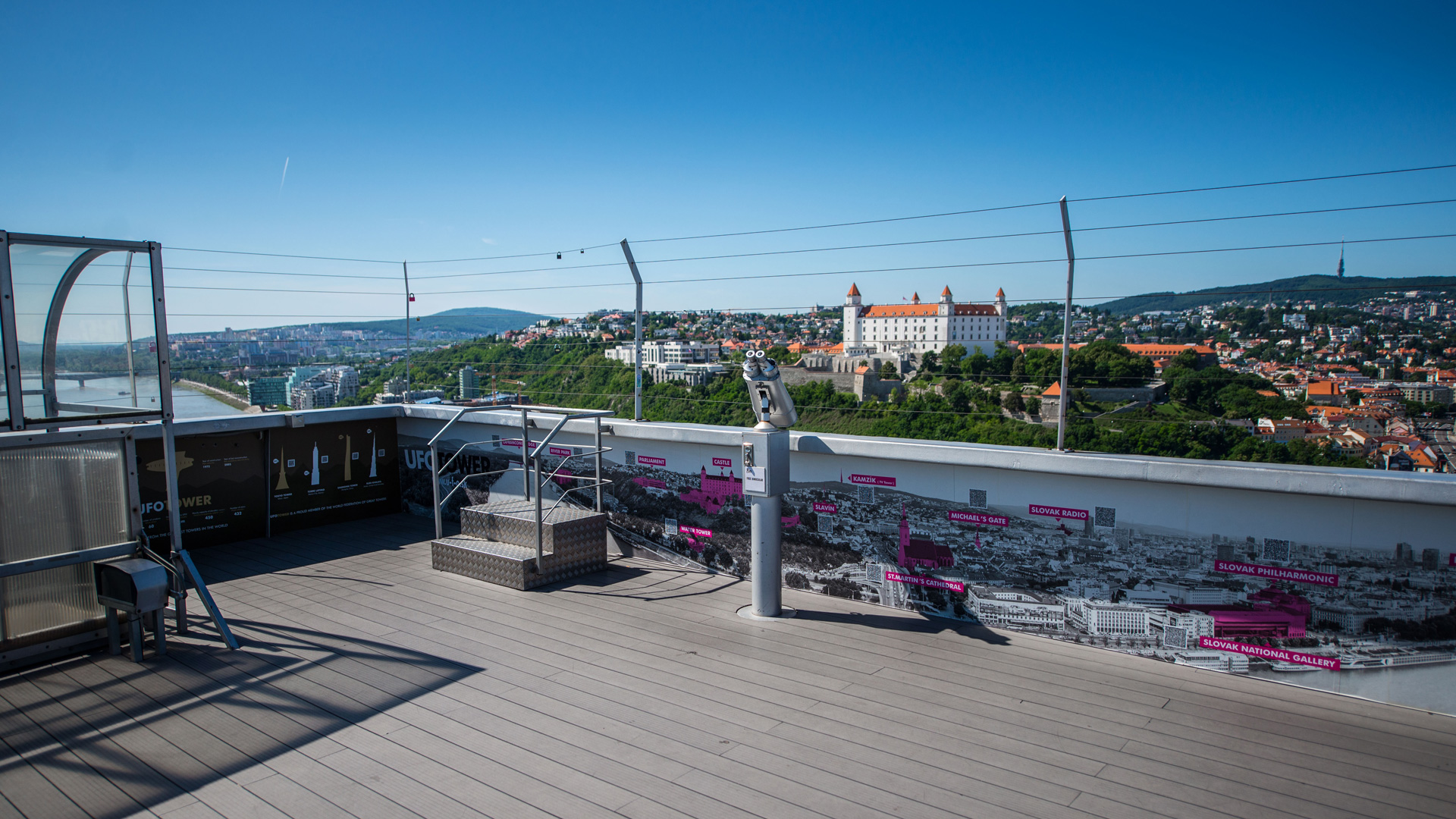 Za 45 sekúnd vás výťah vyvezie z nuly do nemého úžasu. Vo výške 95 metrov, s dohľadom až 100 km spoznáte skutočné čaro stavby, ktorá dotvára neodmysliteľnú súčasť siluety mesta na Dunaji.