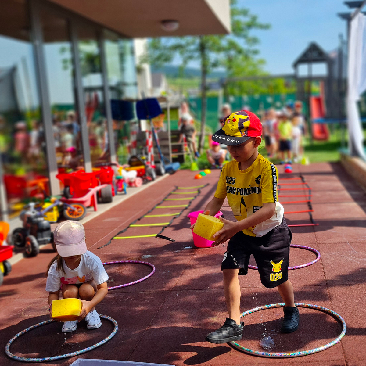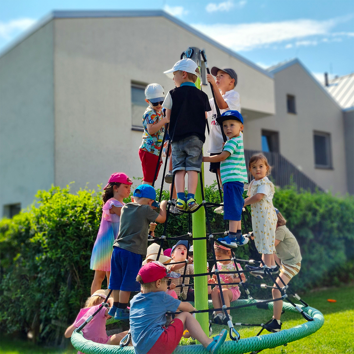 V našej škôlke využívame k hrám a výukovým činnostiam bohatý bezbariérový priestor škôlky. Čo nevedie k statickým činnostiam počas dňa iba v uzavretej triede. Priestranné slnečné 3 triedy, funkčne vybavená telocvičňa, kreatívna dielňa a priestranná jedáleň s miestom pre každé dieťatko. Práca s knihami je od začiatku našim pevným bodom v programe, preto je pre deti k dispozícii pohodlná knižnica v množstvom encyklopédií, obrázkových príbehov a riekaniek.