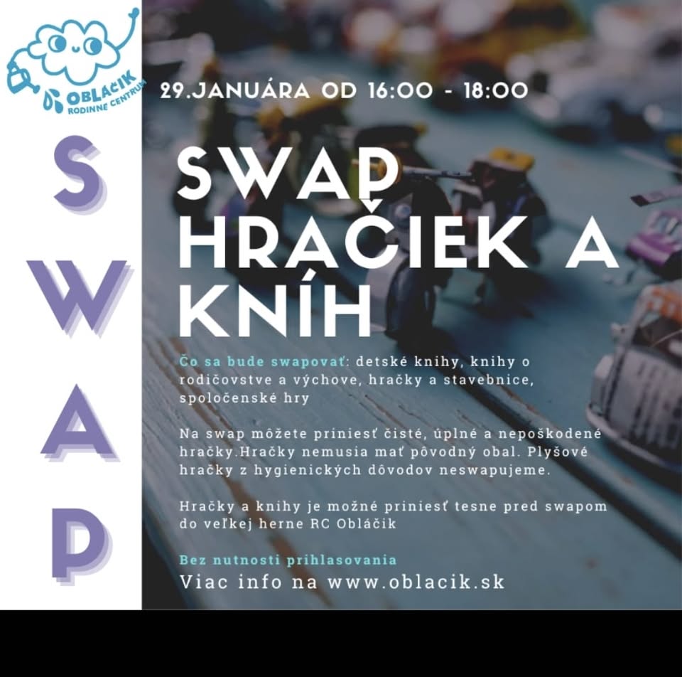 Našli ste pod stromčekom hračky a knihy, ktoré už máte? Hromadia sa Vám doma nevyužité hračky a knihy, z ktorých ste už vyrástli alebo Vás omrzeli? Dajte im druhú šancu a prídte ich vymeniť za iné na SWAP hračiek a kníh do Obláčiku! 🧸📖🧩