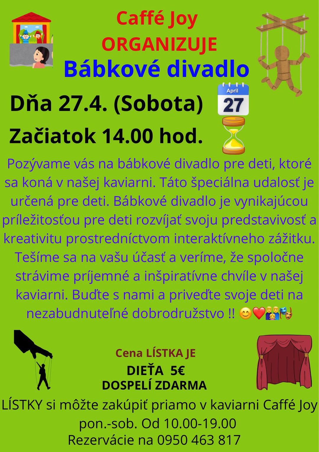 Pozývame vás na bábkové divadlo, ktoré sa uskutoční v našej kaviarni Caffé Joy dňa 27.4. o 14.00. Kaviareň sa nachádza na ulici Štefana Polkorába, Pezinok.