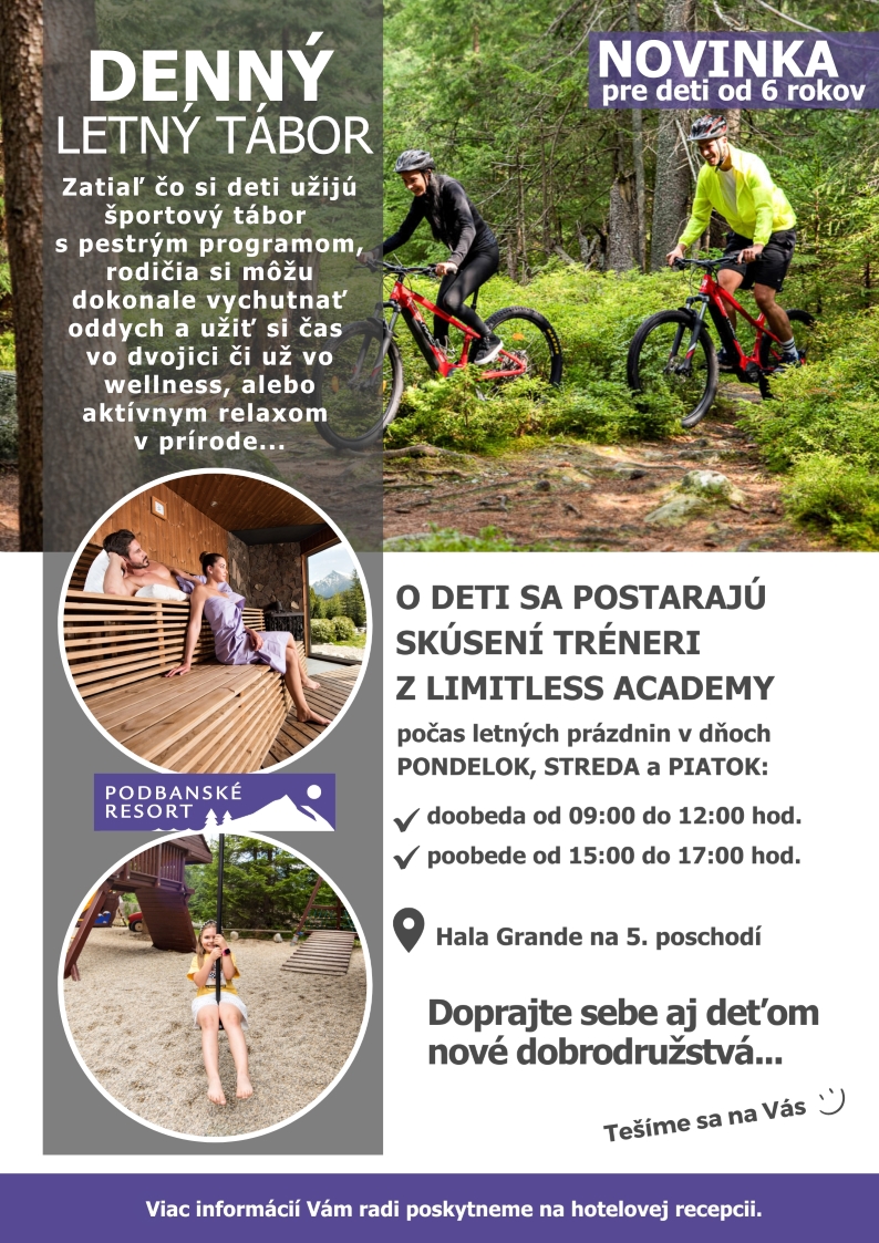 NOVINKA: Zatiaľ čo si deti užijú športový tábor s pestrým programom, rodičia si môžu dokonale vychutnať oddych a užiť si čas vo dvojici či už vo wellness, alebo aktívnym relaxom v prírode. O deti sa postarajú skúsení tréneri z Limitless Academy počas letných prázdnin v dňoch pondelok, streda a piatok v dvoch časoch: doobeda od 09:00 do 12:00 hod. a poobede od 15:00 do 17:00 hod. Denný letný tábor je určený pre deti od 6 rokov – kapacita miest je limitovaná.