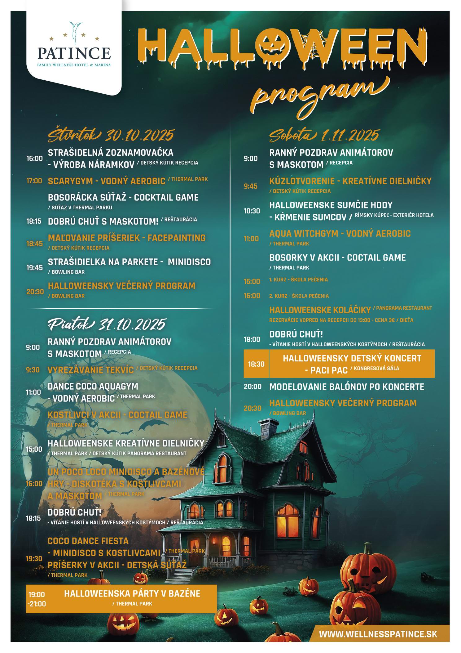 Počas Halloweenskeho pobytu vo Wellness Hoteli Patince si vychutnáte komfortné ubytovanie v moderných izbách a apartmánoch. V cene pobytu je neobmedzený vstup do Thermal parku a Wellness centra s bazénmi, vírivkami a saunami. Pre deti aj dospelých je pripravený pestrý halloweensky animačný program plný súťaží, dielničiek a strašidelnej zábavy. Vrcholom programu bude koncert detskej skupiny PACI PAC. Doprajte si jesenný oddych spojený s wellnessom a rodinnou atmosférou, na ktorú budete dlho spomínať.