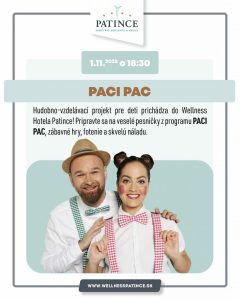 • 1.11.2025 o 18:30 PACI PAC – Hudobno-vzdelávací projekt pre deti prichádza do Wellness Hotela Patince! Pripravte sa na veselé pesničky z programu PACI PAC, zábavné hry, fotenie a skvelú náladu.