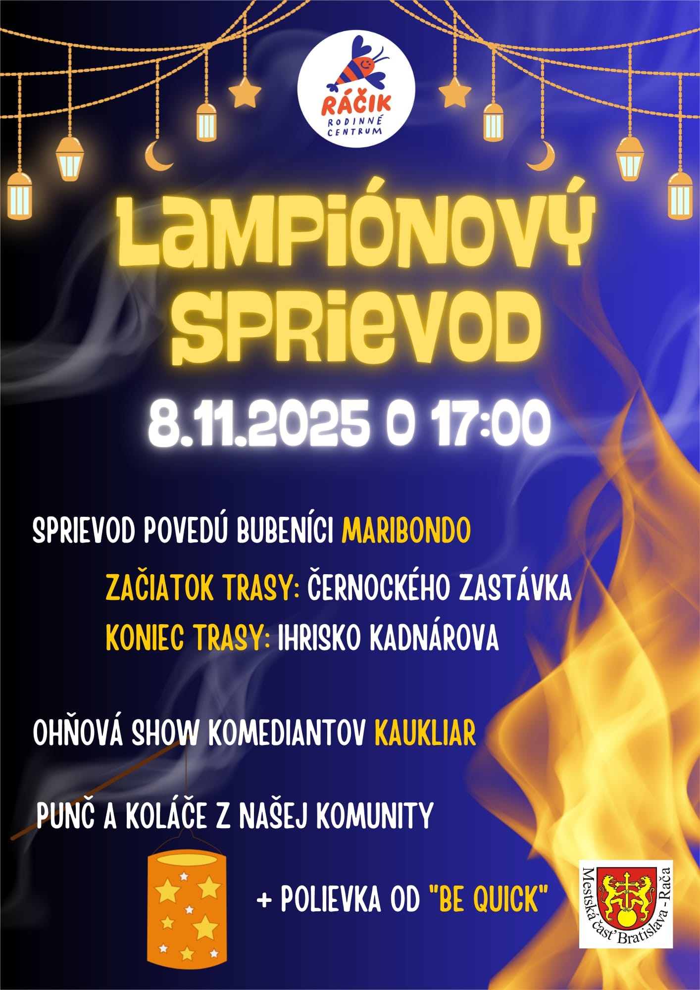 Pripravujeme pre vás už 18. ročník tradičného Lampiónového sprievodu, ktorý sa uskutoční v sobotu 8. novembra 2025 od 17:00. Trasa povedie zo zastávky Černockého na ihrisko Kadnárová (za Lidlom).