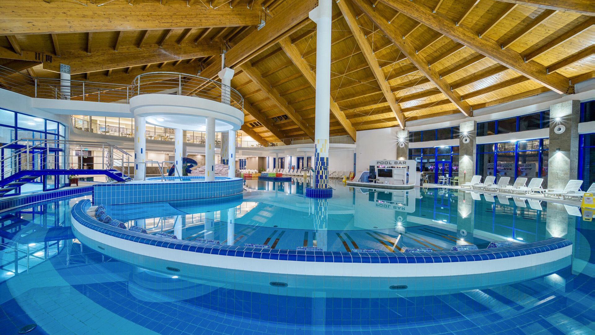 vnútorné termálne bazény: veľký relaxačný bazén, oddychový bazén, vírivka, detský bazén so šmýkalkou