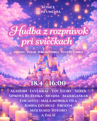 Kúzelný rodinný koncert pri sviečkach vás prenesie do sveta najkrajších animovaných filmov a rozprávok. Hudba z rozprávok pri sviečkach je jedinečná hudobná podívaná s ikonickými melódiami z produkcie Disney, Pixar, DreamWorks a Studio Ghibli v originálnych aranžmánoch v podaní kvarteta: klavír, husle, viola a violončelo.