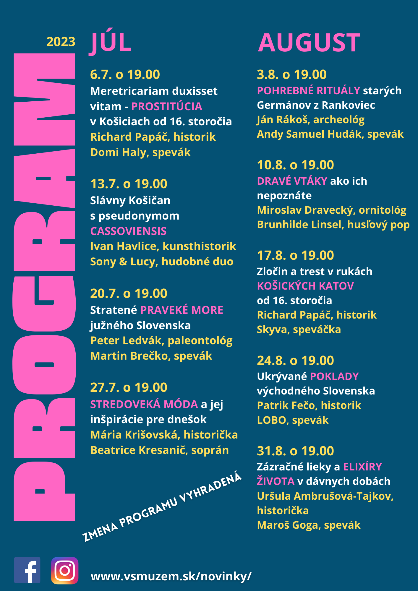 Východoslovenské múzeum v Košiciach, kultúrne zariadenie Košického samosprávneho kraja otvára počas letných mesiacov priestory v areáli Katovej bašty vo večerných hodinách. Pre priaznivcov a návštevníkov sme pripravili 9 tematických večerov, na ktorých predstavia zaujímavé témy z histórie Košíc i východného Slovenska odborníci na slovo vzatí, historici, archeológovia, prírodovedci, či kunsthistorici. Pútavé rozprávanie kurátorov rôznych zbierkových fondov múzea doplní vždy aj zaujímavý hudobný hosť.