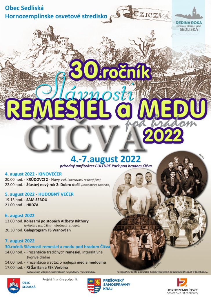 Obec Sedliská a Hornozemplínske osvetové stredisko Vás srdečne pozýva na Slávnosti remesiel a medu pod hradom Čičva.