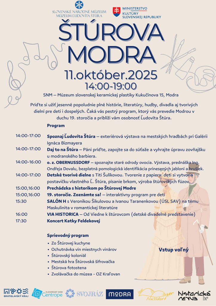 Príďte si užiť jesenné popoludnie plné histórie, literatúry, hudby, divadla aj tvorivých dielní pre deti i dospelých. Čaká vás pestrý program, ktorý vás prevedie Modrou v duchu 19. storočia a priblíži vám osobnosť Ľudovíta Štúra.