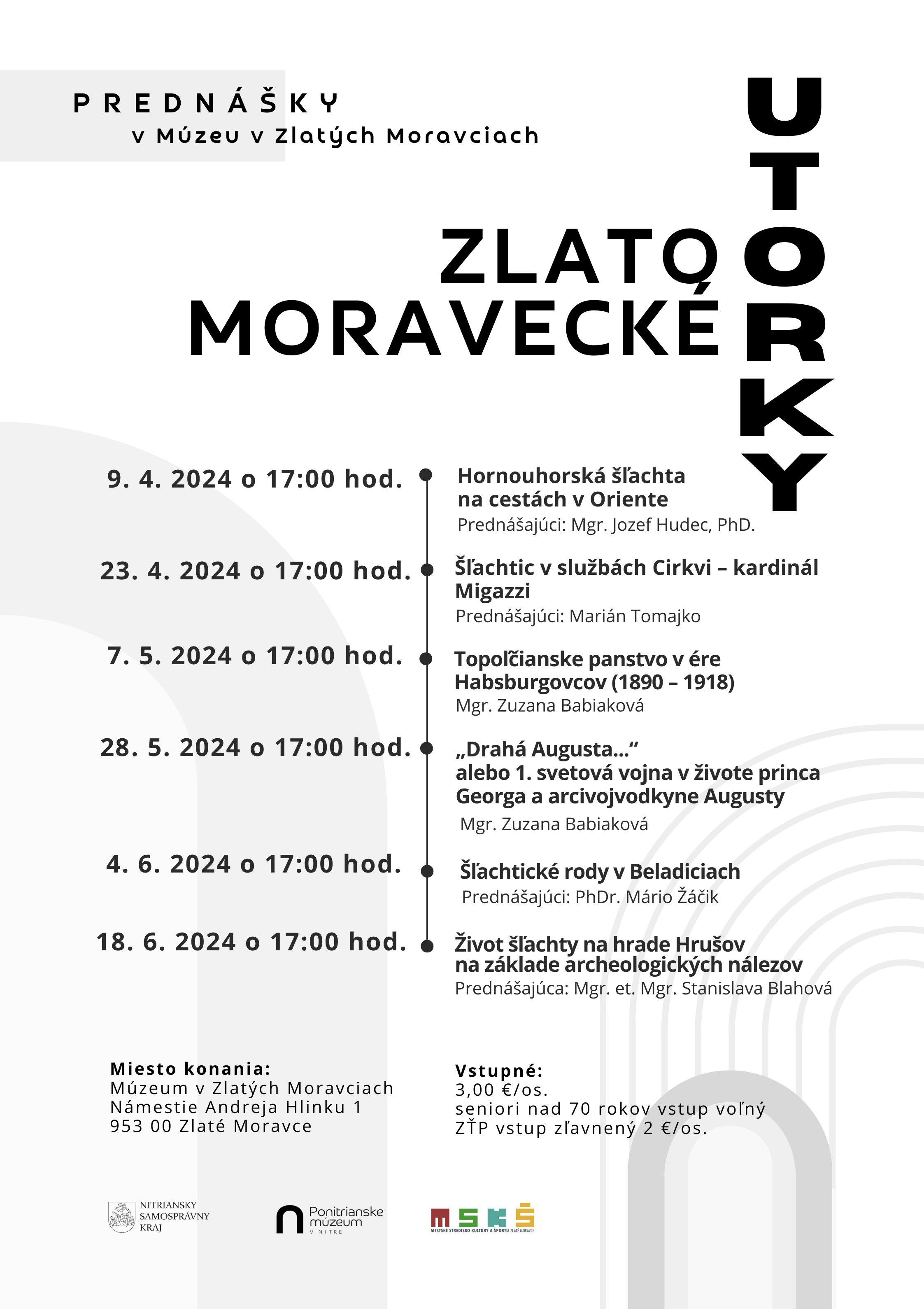 Aj v roku 2024 pokračujeme v cykle prednášok, ktorý je venovaný významným momentom z dejín Zlatých Moraviec, mestu s bohatou históriou, ale aj širšiemu regiónu. Partnerom podujatia je Nitriansky samosprávny kraj.