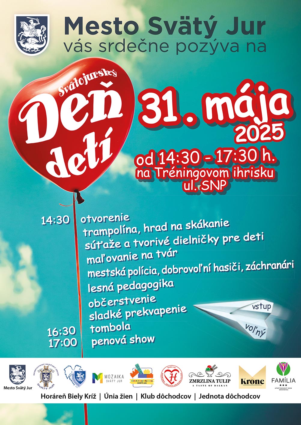 Vás srdečne pozýva dňa 31. mája 2025 od 14:30 hod. na Tréningové ihrisko na ul. SNP, kde sa uskutoční „Svätojurský deň detí“.