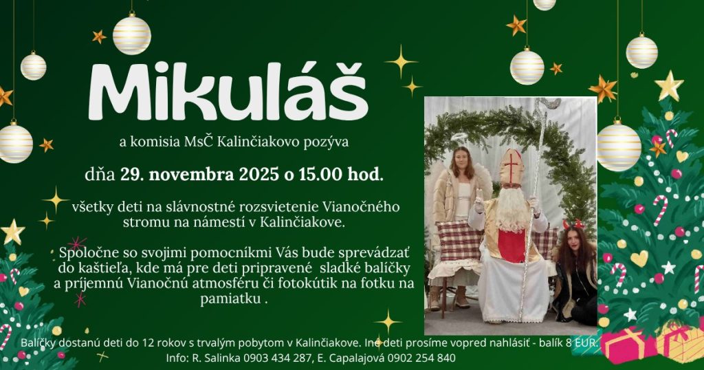 Deti do 12 rokov s trvalým pobytom v Kalinčiakove dostávajú balíčky zdarma. Iné deti, ktorým má dať Mikuláš balíček, treba vopred nahlásiť (ideálne do stredy 26.11.) a vyplatiť cenu balíčku, ktorá je 8 EUR. Deti nahlasujte Romanovi Salinkovi 0903 434 287 a Editke Capalajovej 0902 254 840.