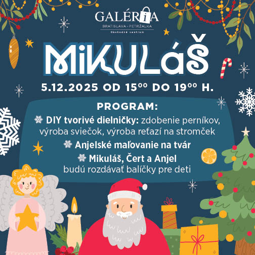Do Galéria Petržalka 5. decembra zavíta Mikuláš! Spolu s anjelom a čertom prinesú bohatý program pre vás aj pre vašich rodičov.