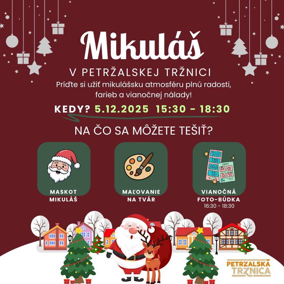 Čaká na vás náš milý maskot Mikuláš, ktorý vykúzli úsmev na každej detskej tvári. Okrem neho sme pre vás pripravili aj maľovanie na tvár, kde si deti môžu vybrať z množstva vianočných motívov, a taktiež vianočnú foto-búdku, ktorá bude otvorená od 16:30 do 18:30 – ideálna na spoločné rodinné fotky či spomienky z tržnice.