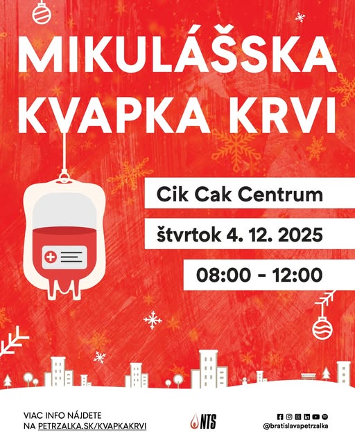 Spolu s Národná transfúzna služba SR vás pozývame na tradičné podujatie Mikulášska kvapka krvi 2025, na ktorom môže až 60 záujemcov darovať niekomu ten najväčší dar – nádej na život. 🤍