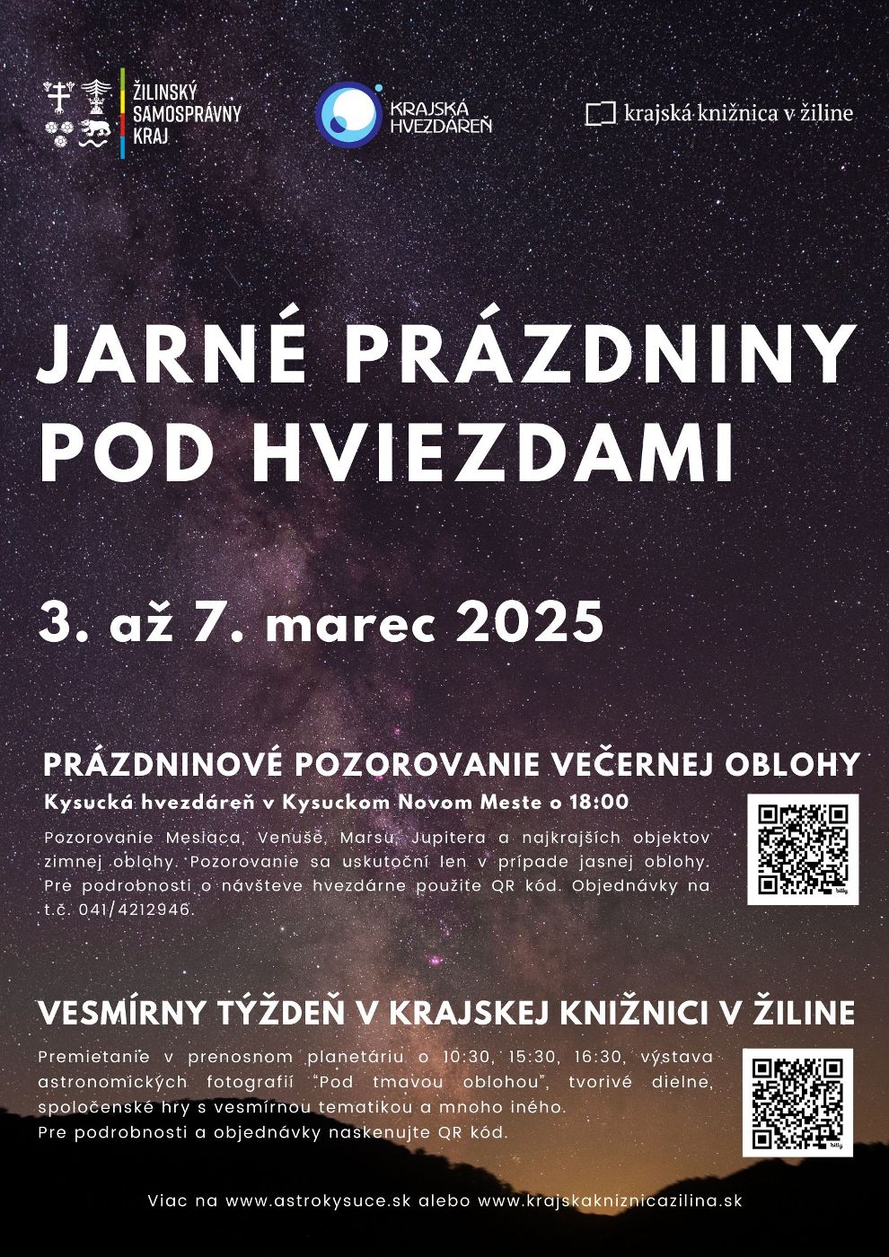 Od pondelka 3. 3. do piatku 7. 3. vždy o 18:00 sa môžete tešiť na pozorovanie pribúdajúceho Mesiaca, žiarivej Venuše, červenkastého Marsu i vznešeného Jupitera a jeho mesiacov. Nevynecháme ani výrazné súhvezdia zimnej oblohy. Keďže počet miest v kupole je obmedzený, potrebná je včasná rezervácia na telefónnom čísle 041/421 29 46. Pozorovania sa uskutočnia iba v prípade priaznivého počasia.
