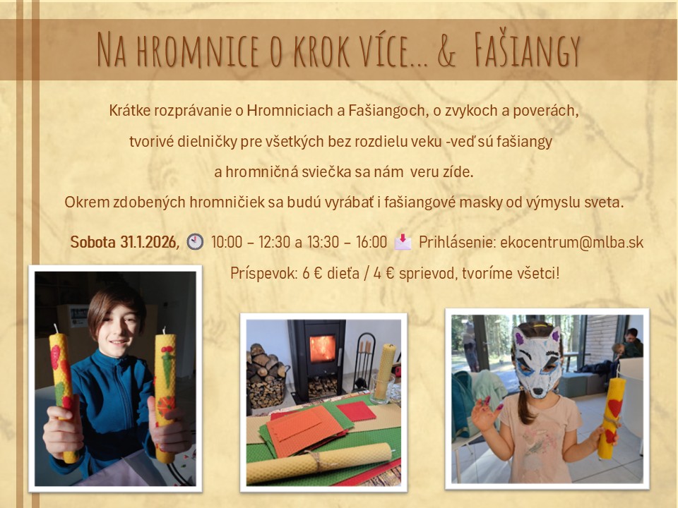 Príspevok: 6 € dietko / 4 € dospelý, tvoriť môžu všetci; prihlásenie na: ekocentrum@mlba.sk.