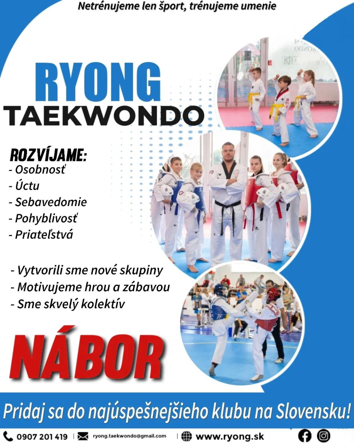 Každý záujemca o cvičenie Taekwondo WT (World Taekwondo – olympijské taekwondo) môže prísť bezplatne na prvý skúšobný tréning do telocvične RYONG GYM na Kresánkovej ulici 3 na Dlhých dieloch v Bratislave. (budova OC Terno, 1. poschodie, bezplatné parkovanie prvé tri hodiny).