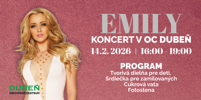 Obchodné centrum Dubeň pozýva všetkých zamilovaných, rodiny aj priateľov na výnimočný valentínsky event, ktorý sa uskutoční 14. februára 2026 od 16:00 do 19:00. Hlavným lákadlom popoludnia bude koncert slovenskej speváčky Emily, ktorá sa predstaví so svojimi najväčšími hitmi a romantickým repertoárom.
