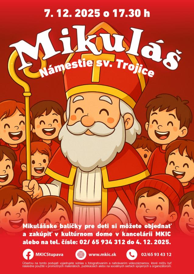 MIKULÁŠ so svojou družinou zavíta do Stupavy na Námestie sv. Trojice v nedeľu 7.12.2025 okolo 17:30. Pre deti je možné objednať mikulášske balíčky.