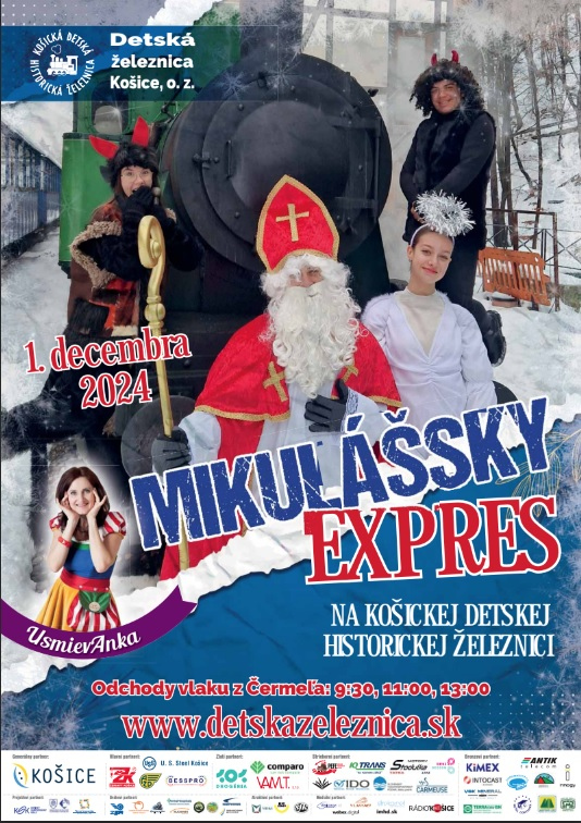Najkrajší Mikulášsky expres na Košickej detskej historickej železnici sa vráti a prinesie so sebou všetku mágiu sviatkov. V Čermeli vám zaspievajú a zatancujú nadané deti zo súboru Hanička. Vyhrievané a ozdobené vagóny, ktoré nám vyzdobia žiaci zo ZŠ Fábryho 44, vás odvezú do rozprávkovej zimnej krajinky Alpinky, kde si s vami zatancuje USMIEVANKA.