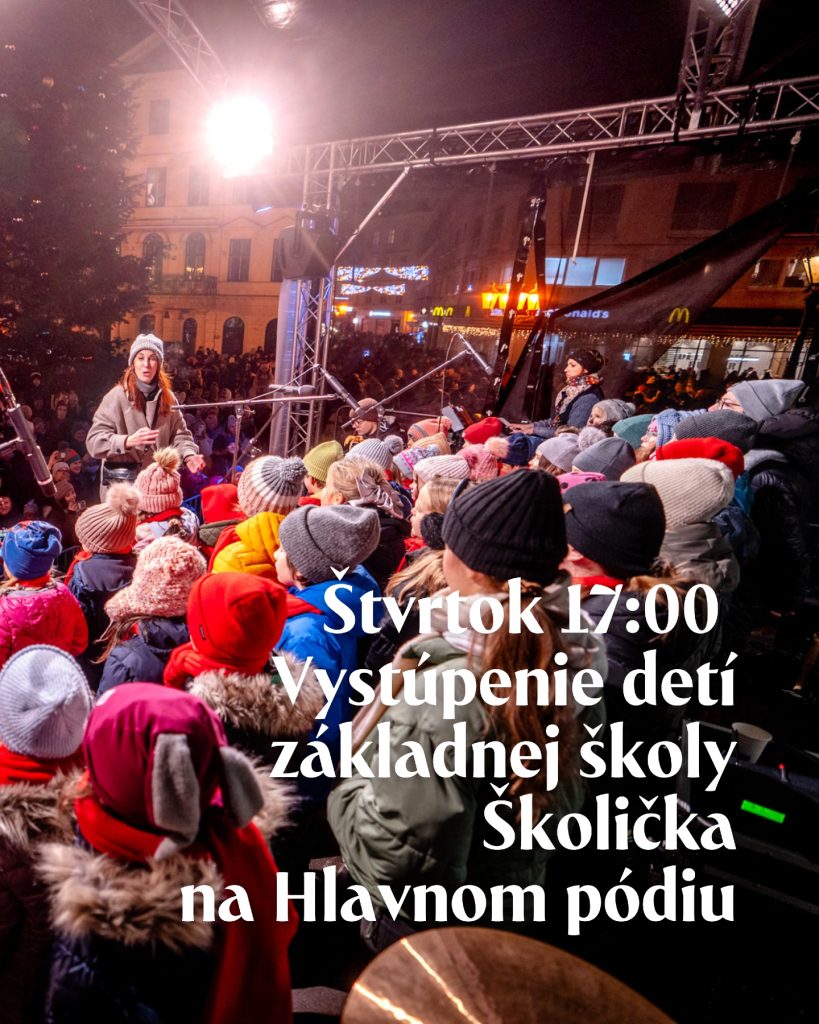 Vystúpenie detí zo základnej školy Školička – malí muzikanti a speváci, ktorí prinesú na námestie tú pravú predvianočnú radosť.