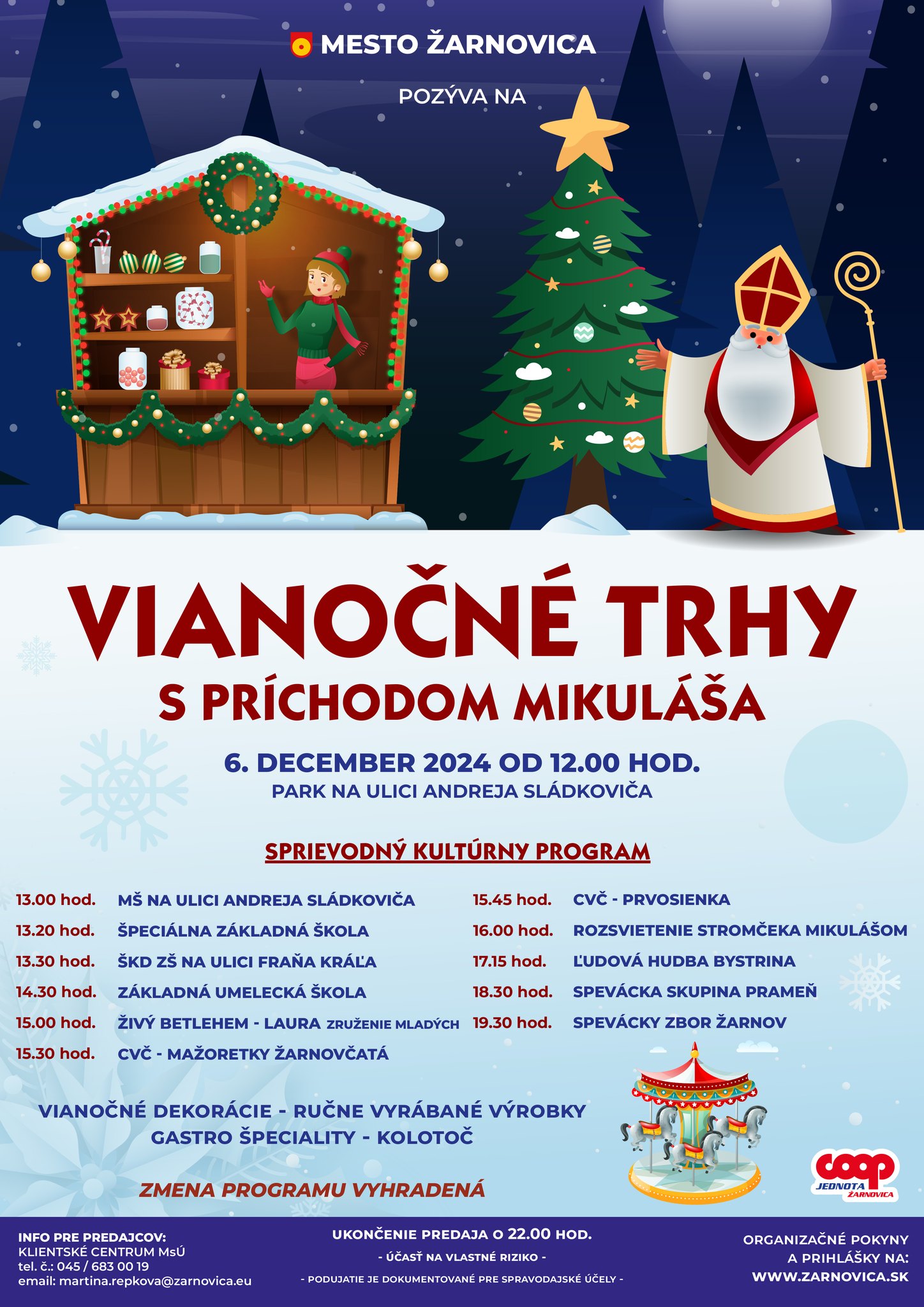 ❄️ Mesto Žarnovica vás pozýva na Vianočné trhy a príchod Mikuláša v piatok 6.12. 🎄 Vianočné trhy sa budú konať od 12.00 hod. až do 22.00 hod. v parku pri vianočnom stromčeku. 🌟 O 16.00 hod. poteší všetky deti príchod Mikuláša 🎅 s jeho pomocníkmi. Príďte prežiť nezabudnuteľnú predvianočnú atmosféru.