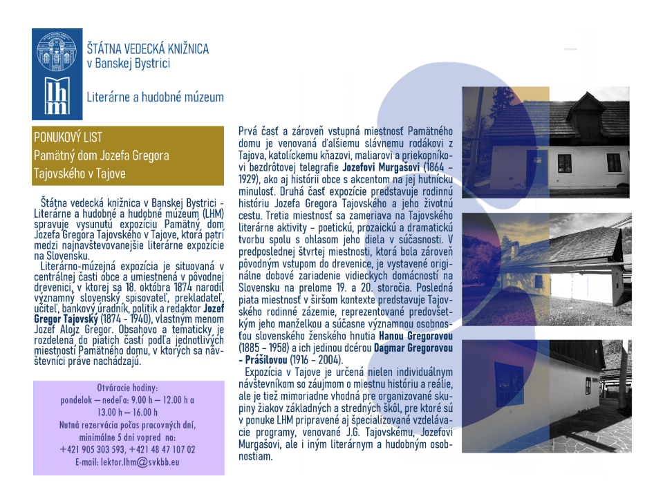 Štátna vedecká knižnica v Banskej Bystrici – Literárne a hudobné múzeum (LHM) spravuje vysunutú expozíciu Pamätný dom Jozefa Gregora Tajovského v Tajove, ktorá patrí medzi najnavštevovanejšie literárne expozície na Slovensku.