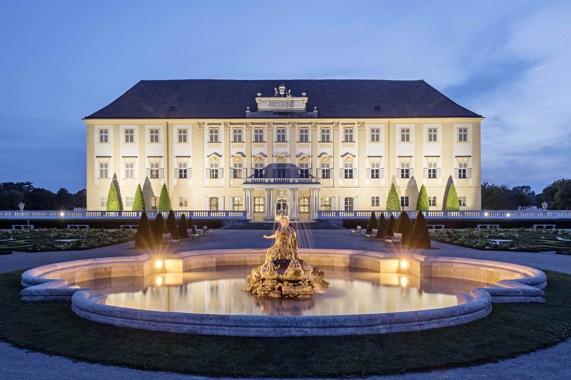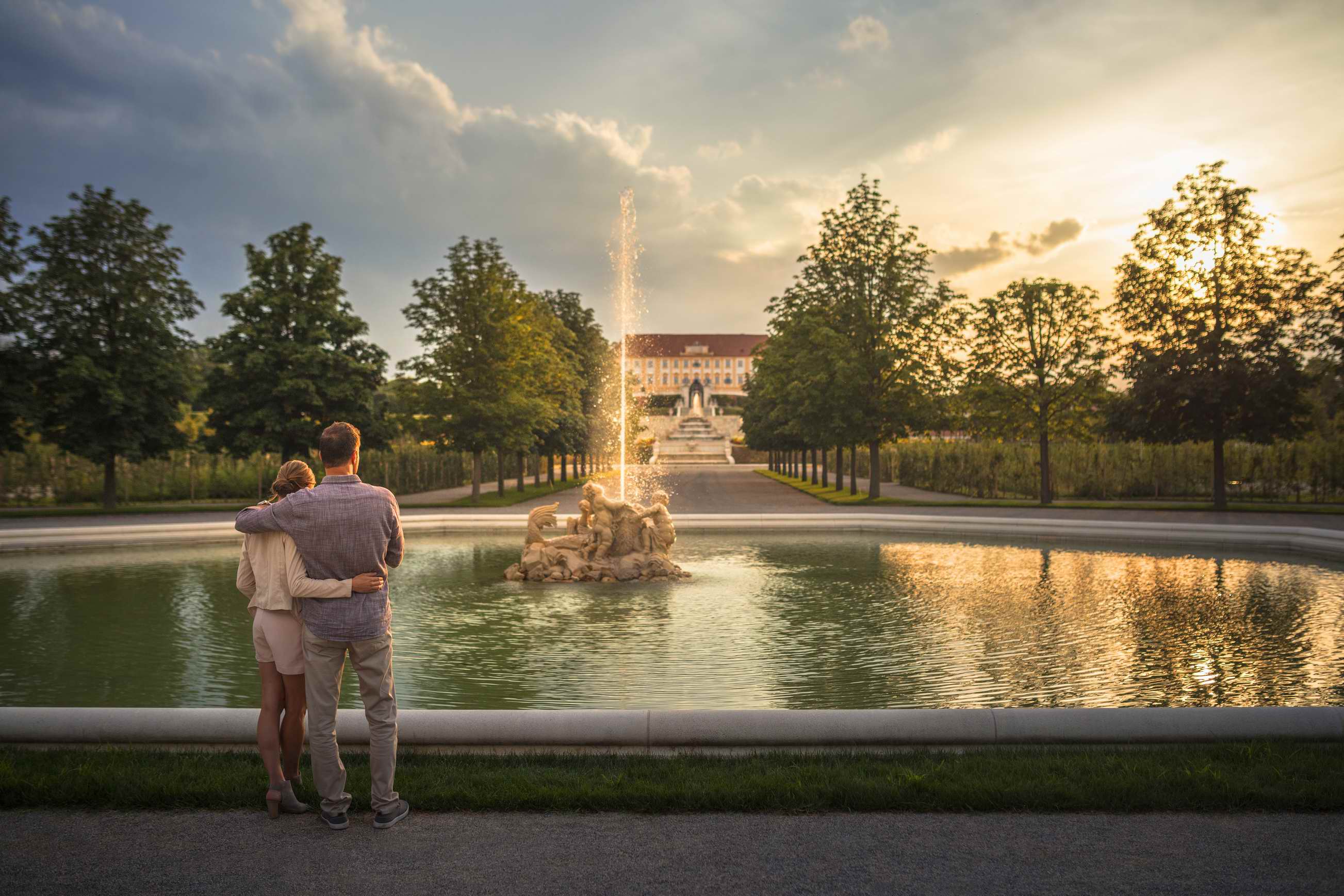 V prírodnej scenérii na Moravskom poli sa rozprestiera impozantný zámok Schloss Hof s nádhernou barokovou záhradou. „Najkrajšia vyhliadka na svete“ – takto sa vyjadril knieža Johann Khevenhüller-Metsch, veľký cestovateľ z čias Márie Terézie, ohromený výhľadom z okien cisárskych apartmánov na terasovitú záhradu. Bohatstvo prírody a ľudská vôľa sa tu spojili, aby vytvorili jednu z najveľkolepejších barokových záhrad doby a skutočne len málo v Európe sa mohlo rovnať jej nádhere, noblese a elegancii. Terasy boli vybudované tak, aby záhrada odhaľovala svoje čaro len postupne krok za krokom a návštevníci si až na poslednom stupni mohli vychutnať nádherný výhľad na celý komplex. Najväčším symbolom prepychu záhradnej architektúry v 18. storočí boli bez pochyby grandiózne fontány. Nielenže poskytovali príjemné osvieženie, ale ich technická náročnosť stála nemalé prostriedky, a tak sa stali nepriamym ukazovateľom bohatstva ich majiteľa a hodnota záhrady sa merala aj počtom vodných prvkov a fontán.