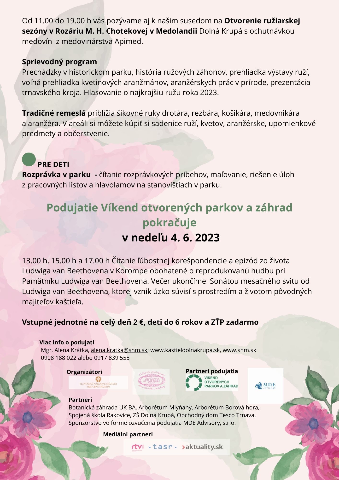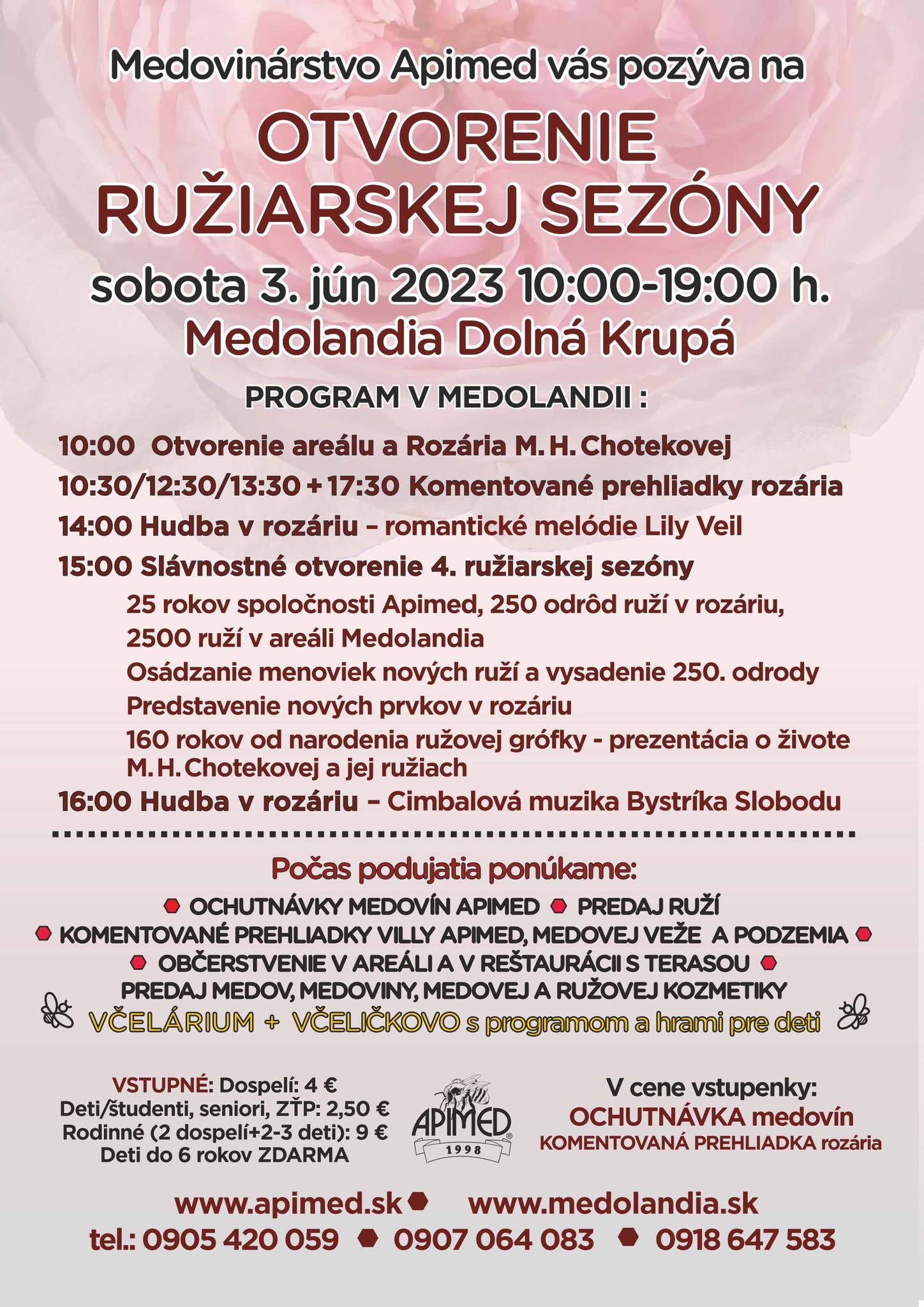 Atmosféru v rozáriu počas otvorenia ružiarskej sezóny spríjemní romantická hudba v podaní Lily Veil a popoludní Cimbalová muzika Bystríka Slobodu. Deti sa budú môcť zahrať hry vo Včeličkove, v Ružovom kráľovstve, prejsť sa po Včelárskom chodníku s pohybovými aktivitami a historickými exponátmi. Nebude chýbať občerstvenie priamo v rozáriu, predaj medov, medoviny i ruží.