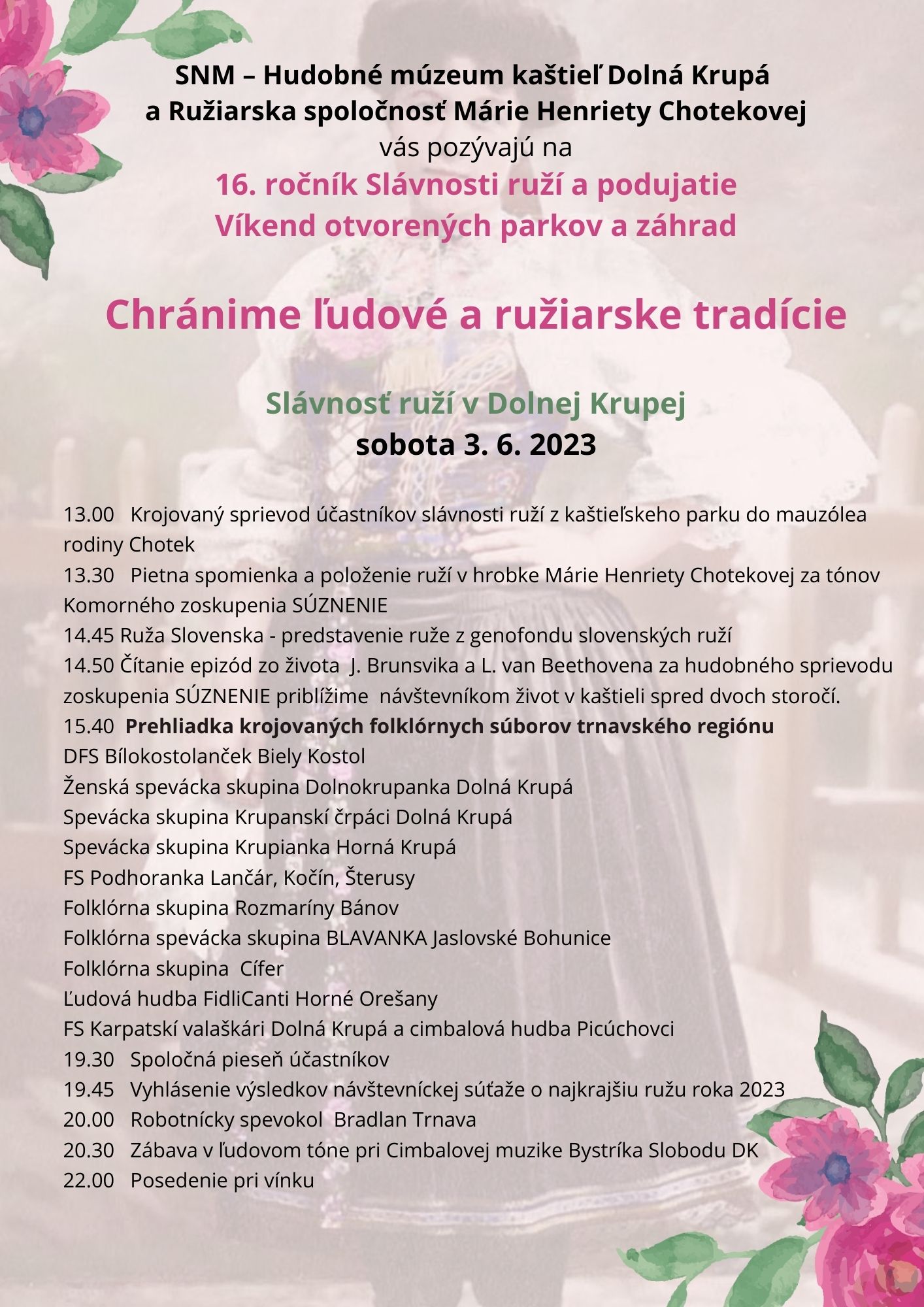 Slávnosť ruží, ktorá sa uskutoční v parku klasicistického kaštieľa Slovenského národného múzea, začne o 13:00 h. a návštevníci si budú môcť zakúpiť sadenice ruží alebo hlasovať za najkrajšiu ružu roka 2023. Súčasťou podujatia bude tiež krojovaný sprievod z kaštieľskeho parku do mauzólea rodiny Chotekovcov, vystúpenia speváckych skupín a folklórnych súborov, výstava ruží, tradiční remeselníci i detské predstavenia a atrakcie.
