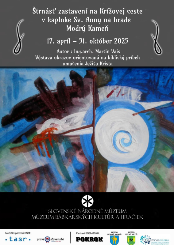 Slovenské národné múzeum – Múzeum bábkarských kultúr a hračiek, hrad Modrý Kameň Vás pozýva na výstavu „Štrnásť zastavení na Krížovej ceste“. Výstava bude pre verejnosť sprístupnená od 17. apríla do 31. októbra 2025 v priestoroch kaplnky sv. Anny na hrade Modrý Kameň počas otváracích hodín múzea.
