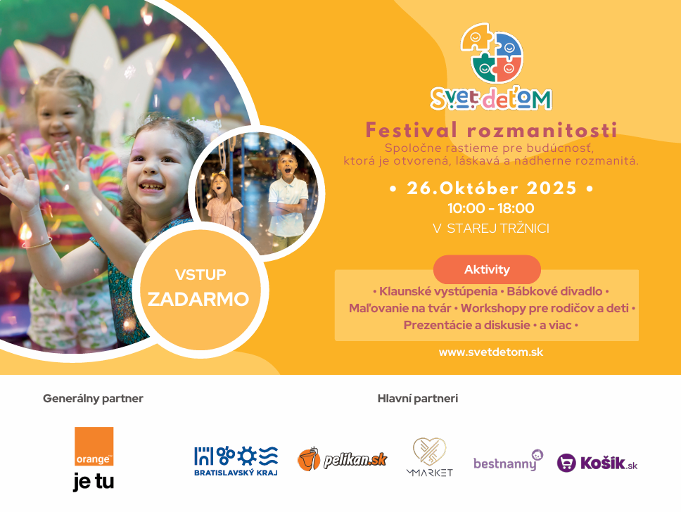 V spolupráci so Starou tržnicou pripravujeme 26. októbra 2025 v Bratislave prvý ročník festivalu Svet deťom. Program sa bude konať medzi 10:00 – 18:00.