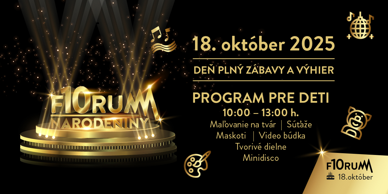 - 18. 10. počas oslavy sa uskutoční live žrebovanie hlavnej ceny – darčekových poukážok v hodnote 1000 €