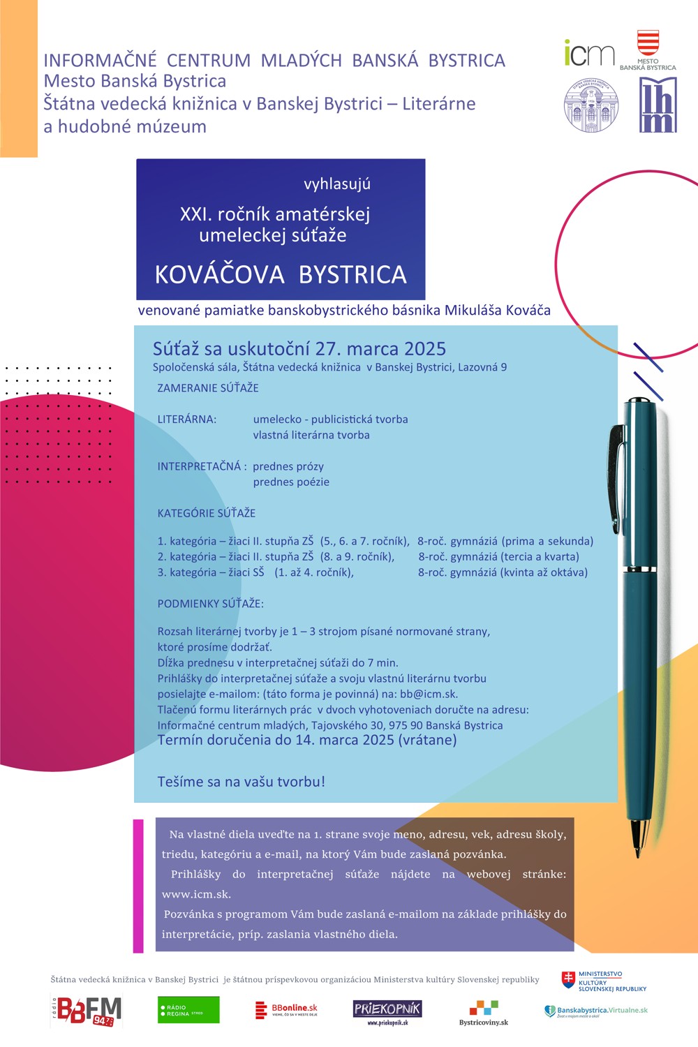 Informačné centrum mladých Banská Bystrica, Štátna vedecká knižnica v Banskej Bystrici – Literárne a hudobné múzeum a Mesto Banská Bystrica vyhlasujú XXI. ročník súťaže KOVÁČOVA BYSTRICA 2025.