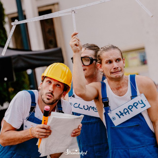 S veľkou chuťou do práce, ale bez akejkoľvek organizácie sa na stavenisku činia traja nemotorní stavební robotníci – tešiť sa môžete na fascinujúce akrobatické výkony, originálne žonglovanie a srdečný smiech.