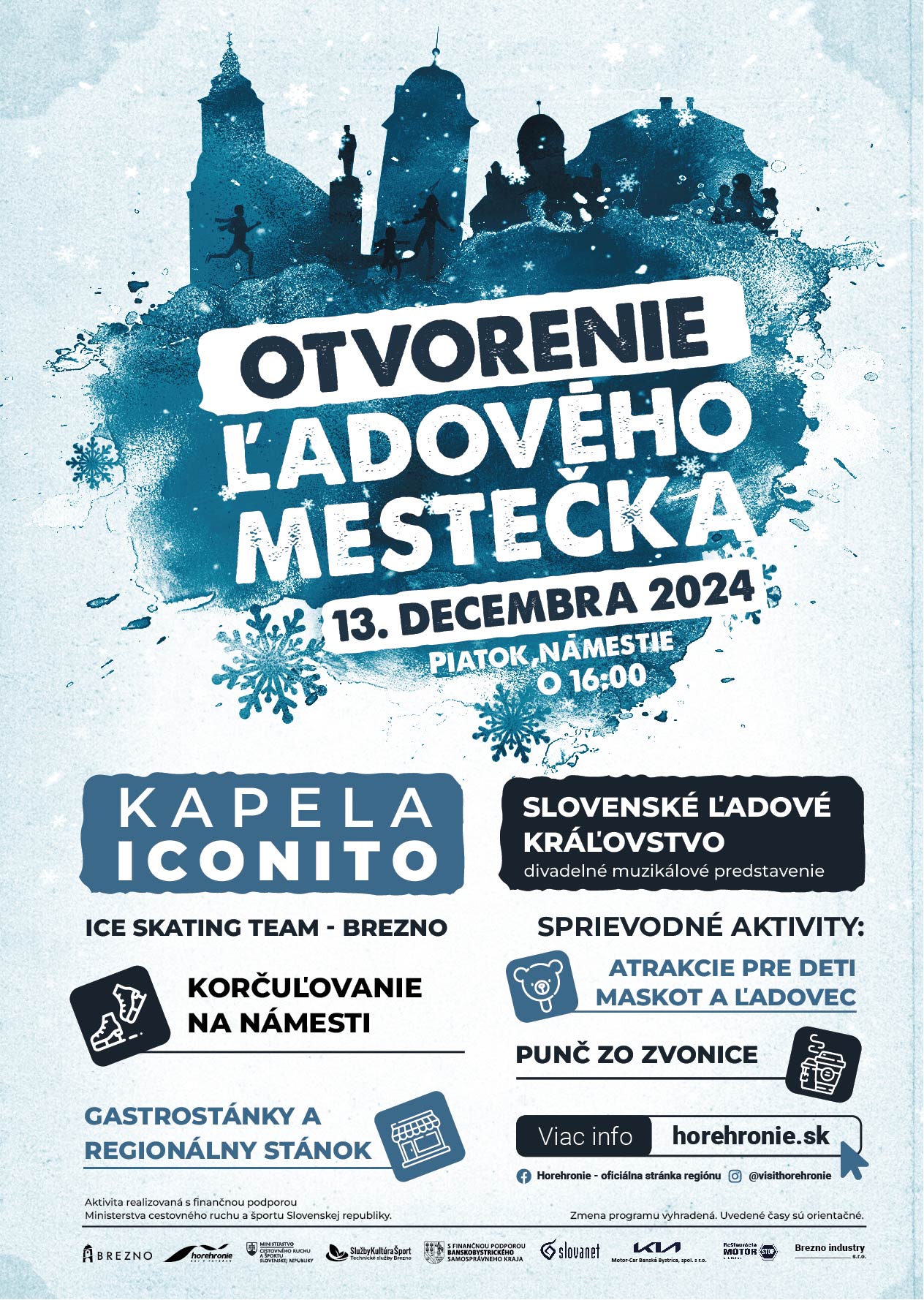 ,,Ľadové kráľovstvo“ a krasokorčuliarmi z Ice Skating Team – Brezno. Pódium bude patriť Kapele Iconito
