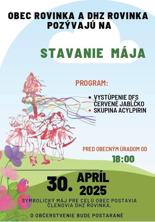 Obec Rovinka a Dobrovoľný hasičský zbor obce Rovinka Vás srdečne pozývajú na Stavanie mája, ktoré sa uskutoční v stredu 30. apríla 2025 o 18.00 pred obecným úradom. Vystúpi DFS Červené jabĺčko a hudobná skupina ACYLPIRIN. O občerstvenie bude postarané.