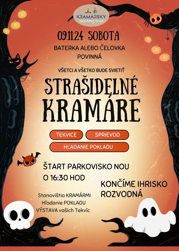 Na Kramároch bude strašiť. Urobme si spoločne prechádzku po Kramároch kde si na cestu zoberieme baterky , pohľadáme poklad , urobíme výstavu tekvíc a zakončíme všetko na ,,strašidelnom,, ihrisku Rozvodná.