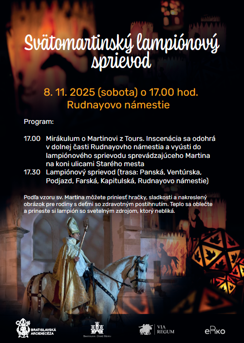 Na Rudnayovom námestí sa 8. novembra o 17:00 začne mirákulum o svätom Martinovi z Tours, ktoré vyústi do lampiónového sprievodu Starým Mestom. Vezmite si lampión so svetlom, ktoré nebliká, teplo sa oblečte a pridajte sa.