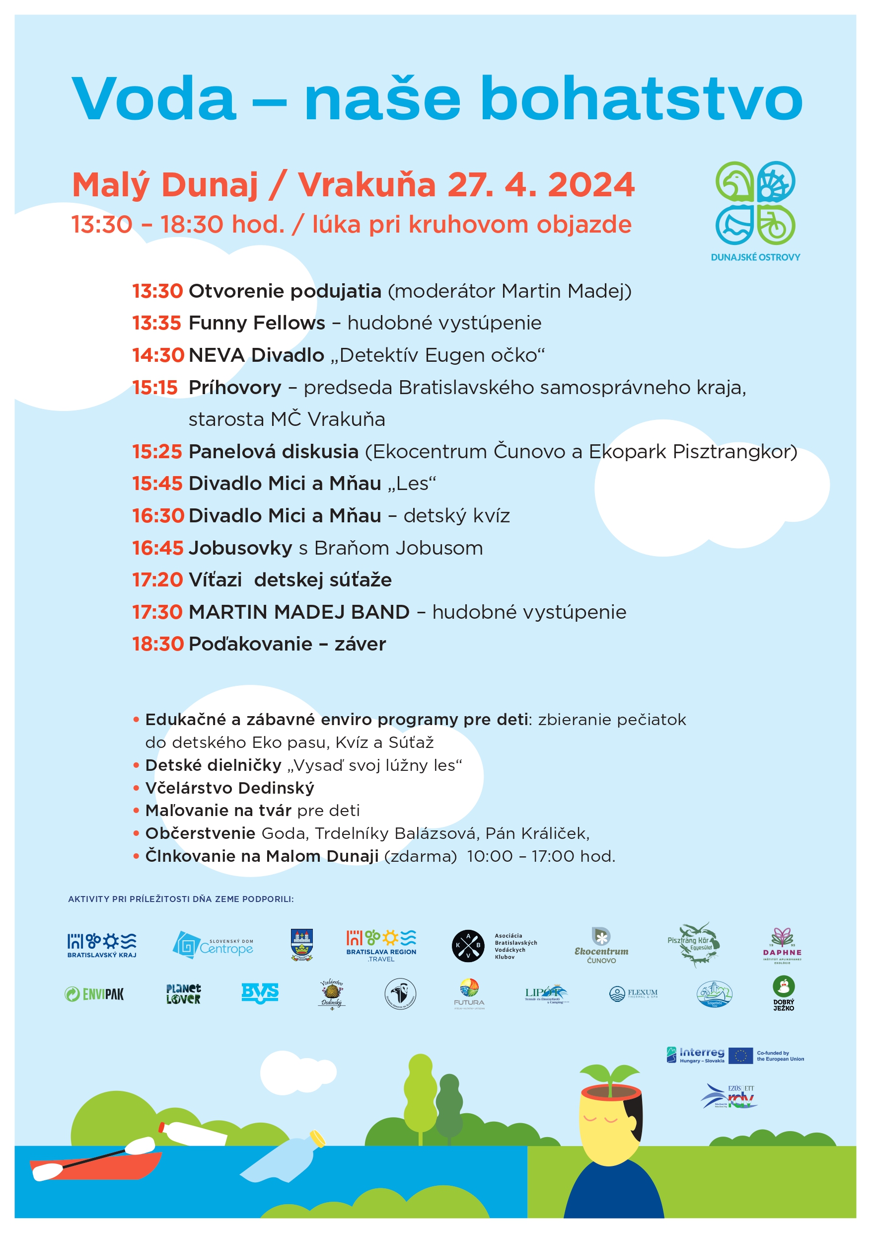 Tretí aprílový víkend je preto venovaný vode a okolitej prírode. Čaká vás člnkovanie na Malom Dunaji a to úplne zdarma, divadlá pre deti Mici a Mňau a tiež zábavné hudobné vystúpenie Funny Fellows. Panelová diskusia s Pisztráng Kör Egyesület a novootvreným Ekocentrom Čunovo