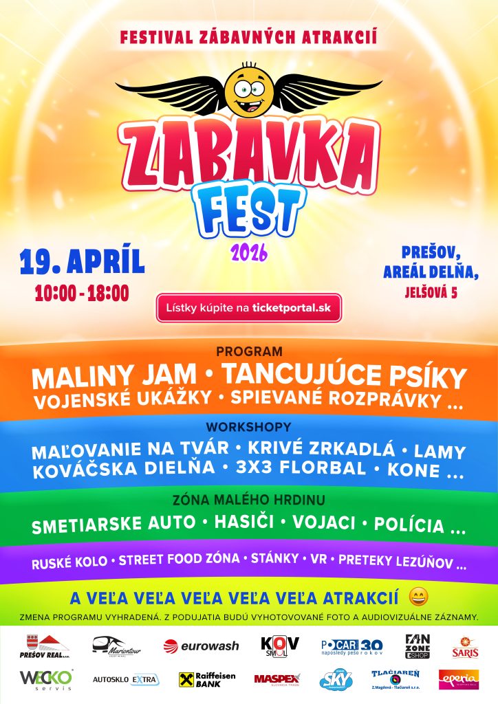 Prešov sa po roku opäť pripravuje na jedno z najväčších rodinných podujatí sezóny. V nedeľu 19. apríla 2026 sa areál prírodného kúpaliska Delňa premení na farebný svet atrakcií, vystúpení, workshopov a rodinnej pohody. ZABAVKA FEST 2026 chce osloviť nielen deti, ale aj rodičov a starých rodičov, ktorí hľadajú deň plný zážitkov na jednom mieste. Brány festivalu sa otvoria o 10.00 hodine a program potrvá až do 18.00 hodiny. Headlinerom je kapela MALINY JAM, ktorá deti poznajú z TV a detských relácii.