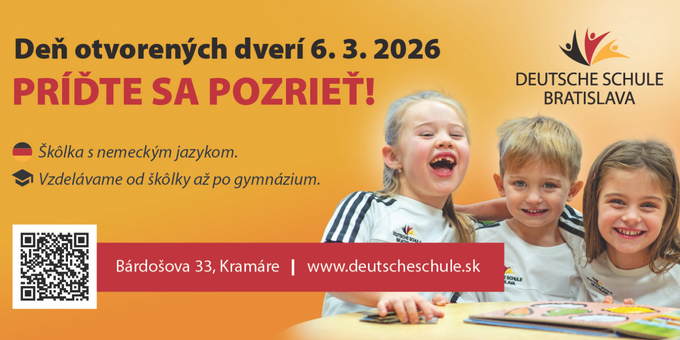 Súkromná materská škôlka Deutsche Schule Bratislava pozýva rodičov detí v predškolskom veku na deň otvorených dverí, ktorý sa uskutoční 6. marca 2026. Príďte spoznať rešpektujúce a podnetné prostredie, v ktorom deti prirodzene vyrastajú s nemeckým jazykom.