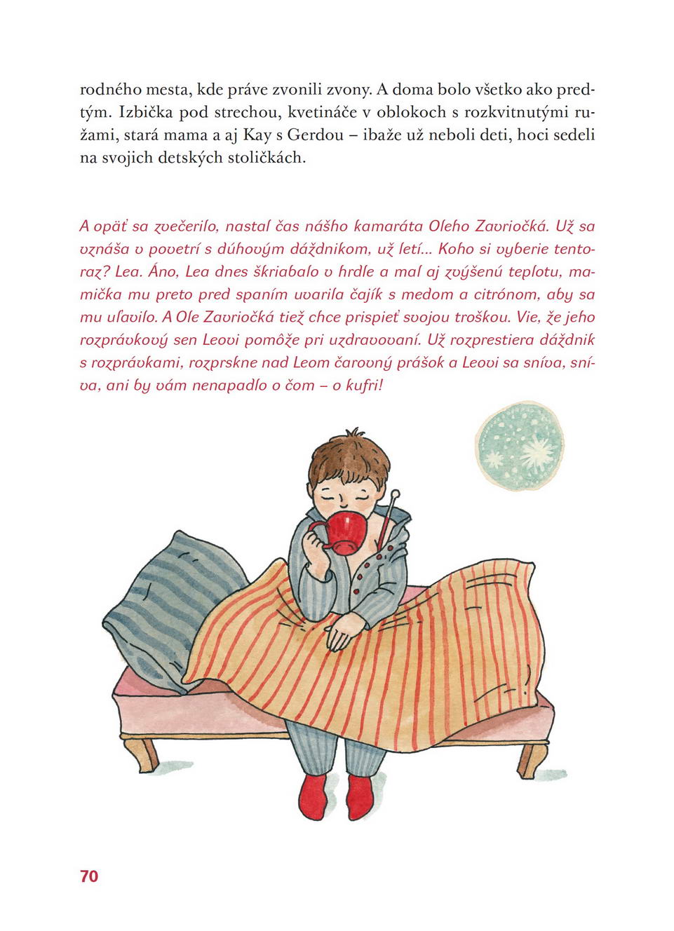 Nik nevie toľko rozprávok ako Ole Zavriočká. Pod pazuchami nosí dva dáždniky – jeden s obrázkami a rozprávkami pre deti, ktoré boli v ten deň poslušné, druhý, prázdny, rozprestiera nad neposlušnými deťmi, tým sa nesníva nič. Večer, keď už deti ležia vo svojich postieľkach, tichučko si otvorí dvere do detských izbičiek, takisto tichučko sa zakráda k detským postieľkam, frkne deťom do očiek čarovného prášku, aby sa im zavreli, veď preto sa volá Ole Zavriočká, a keď už deťúrence spinkajú, sadne si na posteľ a rozpráva. Jeho rozprávky sú také pútavé, že ich pre deti a aj pre ich rodičov na večné veky spísal veľký dánsky rozprávkar Hans Christian Andersen.